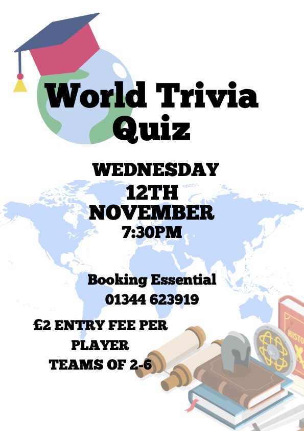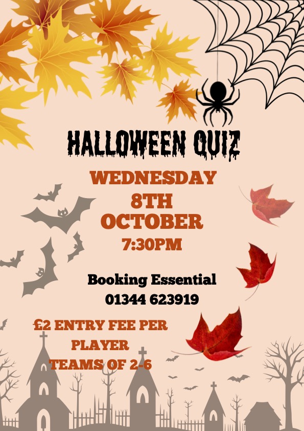Upcoming Quiz Nights: Wednesday 8th October, Wednesday 12th November, Tuesday 9th December at 7.30 pm. Booking essential.