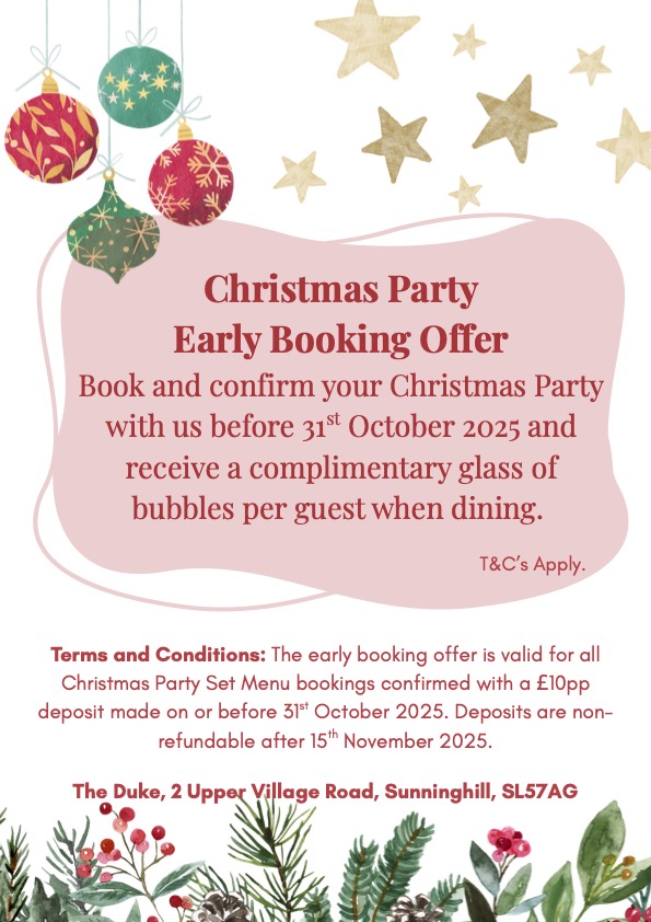 Book and confirm your Christmas Party with us before 31st October 2025 and receive a complimentary glass of bubbles per guest when dining. The party menu price is set at 2 courses for £31pp and 3 courses for £36.50pp.